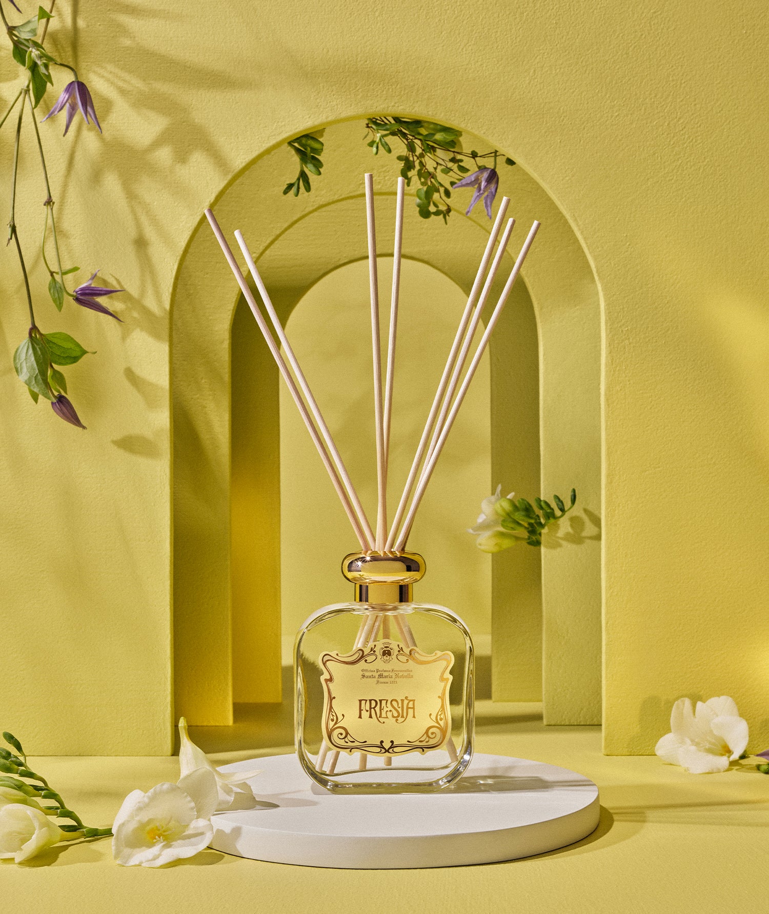 Ein reiner, frischer und anmutiger Duft, der die Geschichte einer üppigen Natur und ihrer unendlichen Formen erzählt. Lassen Sie lebendige Frische in Ihr Zuhause: Denn Fresia überzeugt auch als einzigartiger, subtiler Raumduft.